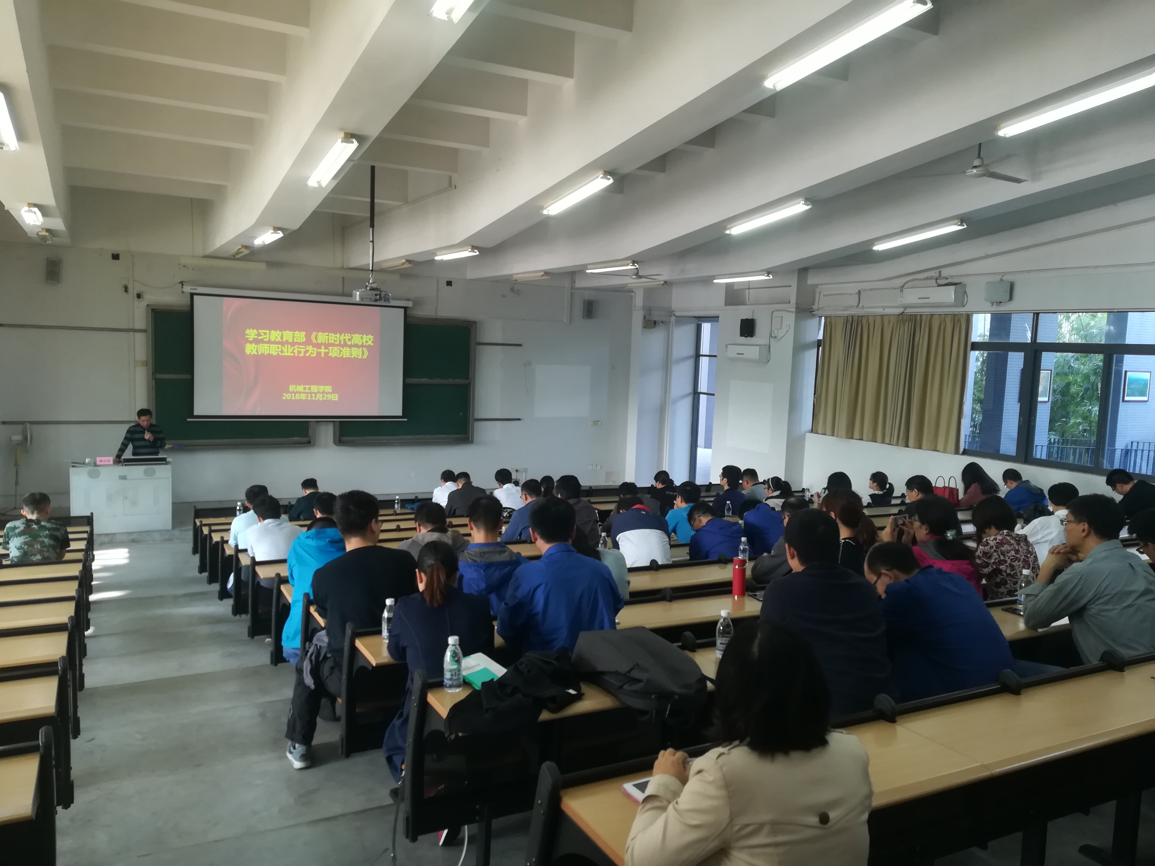 2018年11月29日下午,williamhill在教学楼6E206组织全院教职工学习《新时代高校教师职业行为十项准则》(以下简称“准则”),会议由党总支书记钟守炎主持。