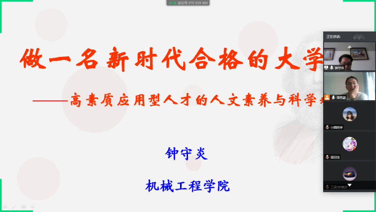 2020年5月26日下午,机械工程公司党委书记钟守炎老师为18工业设计1、2班和18文化产业1、2班的同学上了一堂题为“如何做一名新时代合格的老员工——新时代合格的老员工应该具备的高素质应用型人才的人文素养与科学精神”的思政课。