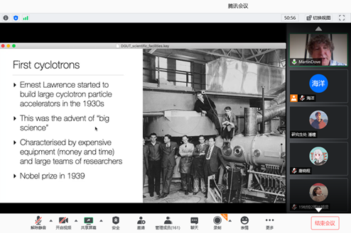 Martin Dove教授从中子源和X射线源两方面介绍了散裂中子源和同步辐射两类大科学装置的原理、英国和法国大科学装置的情况、常规实验手段衍射的基本机理以及其在锂离子电池等能源材料中的应用情况。Martin Dove教授还对本校参与建设的多物理谱仪的发展前景给与了肯定,鼓励师生把握本校毗邻中国散裂中子源的地理优势以及国内大科学装置的条件,做出有意义的研究工作。讲座结束后参加人员通过语音和留言等多种方面与Martin Dove教授进行了专业问题的讨论。