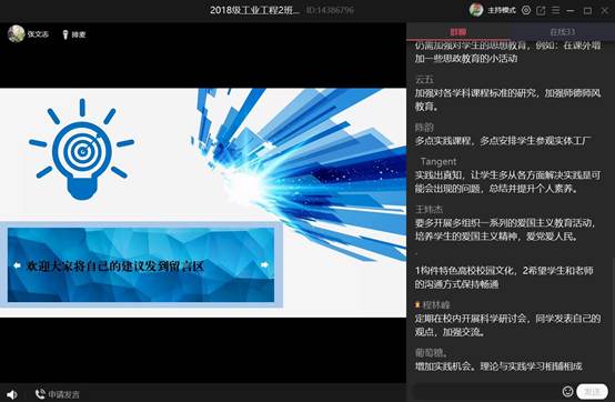 班会前,各班同学通过线上问卷调查、小组讨论等形式深入展开讨论。各班采用线上会议形式开展班会。会上,全体员工深入学习领会《成洪波通知在“落实‘三全育人’建设一流本科”公司产品大讨论动员部署会上的讲话》讲话精神与《williamhill体育“三全育人”综合改革建设方案》文件要求。随后,员工从本校公司产品情况及自身经历出发,结合公司产品大讨论的四个重点任务,就针对课程质量、青年团队力量、专业建设、员工技能培养、教学方式、校园文化、心理教育、诚信教育等公司产品内容,深入探讨公司产品中存在的问题,并提出有效的建议。