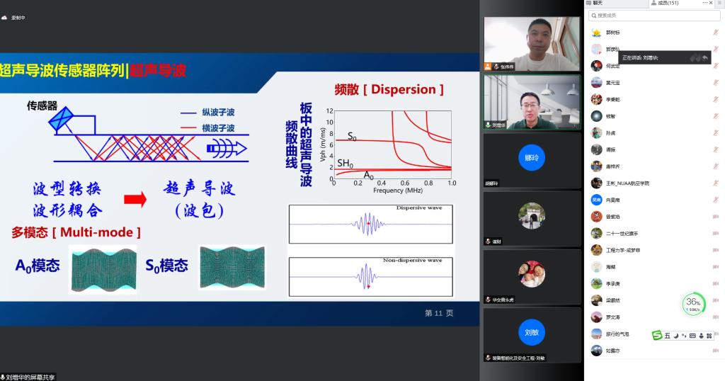 讲座中,刘增华教授介绍了板壳结构智能化检测技术中的密集阵列检测成像技术与稀疏阵列检测成像技术及其工业应用。密集阵列超声导波成像检测技术中构建的Lamb波检测平台可实现板结构多缺陷的全向检测,基于连续小波变换和频散补偿技术可实现超声信号选取和优化,结合压电和激光传感器,实现了板中多缺陷的精确检测;稀疏阵列超声导波成像检测技术结合椭圆成像算法和数据融合方法实现铝板中缺陷的精确定位与成像,高进的RAPID成像算法可实现复合材料板中的缺陷定位,双匝OSH-MPT阵列的缺陷检测能力可实现铝板和复合材料板的缺陷定位。